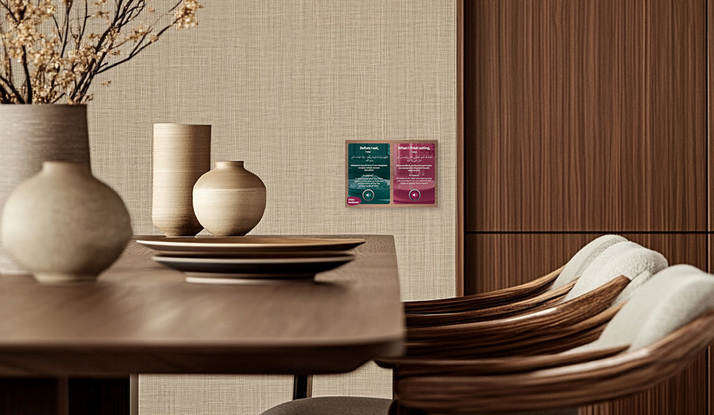 Simply touch the button, and your child will hear the correct recitation of each dua, allowing them to practice and memorise with confidence. The plaques also display the duas in Arabic text, English transliteration & English translation.